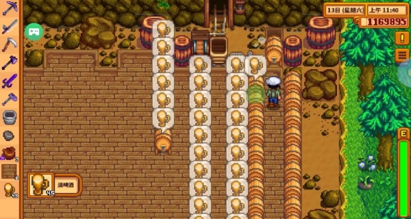 星露谷物语酿酒方法:酿酒的前提条件要先将房屋升级成最高级,然后找木匠罗宾加装地窖。地窖可以将普通的果酒和蔬菜汁陈酿成更高品质的银星,金星,或紫星,从而增加售价。再将耕种水平提高到8级,解锁酿酒桶的配方。酿酒桶能够让你将水果酿成果酒,将蔬菜酿成蔬菜汁。收集树液,砍伐树木,冶炼矿石,准备酿酒桶的材料。每个酿酒桶需要30个木材,1个铜锭,1个铁锭,和1个树脂。在背包制作栏内,找到酿酒桶,点击制做。可以制作多个酿酒桶,放到农场或是别的地方,只要有足够的空间即可。
