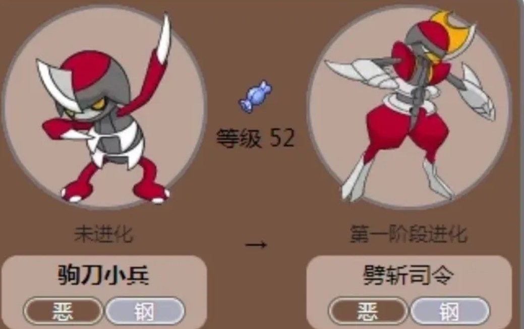 在宝可梦游戏中玩家将能够将人形的宝可梦驹刀小兵升级到52级后即可进行进化,驹刀小兵进化后可成为劈斩司令,驹刀小兵是恶属性和钢属性的宝可梦。首先玩家们需要进入游戏中带着驹刀小兵找人对战升级,之后将驹刀小兵升级到52级的等级,看过进化动画后,驹刀小兵即可进化成劈斩司令。驹刀小兵:进化链:驹刀小兵→劈斩司令→仆刀将军;劈斩司令进化条件:等级为52级或以上进化;仆刀将军进化条件:击倒3只率领着驹刀小兵群体的携带有头领凭证的劈斩司令后提升等级进化;