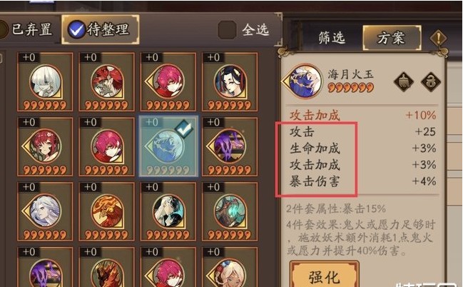 阴阳师御魂强化技巧如下:1、在御魂的选择方面,玩家需要先挑选一些值得强化的御魂,挑选六星御魂,一般选择针女和破势来堆损害。2、挑选六星御魂,六号位主属性挑选暴击、二号位和四号位主属性挑选进攻加持。3、主属性挑选之后,再看看副特性,副特性也主选进攻、进攻加持、暴击等提升进攻属性御魂,其他特性也可以适当堆一点。4、上述准备工作做好后就可以开始加强御魂了,一般用一星、二星、三星、四星御魂用于加强。