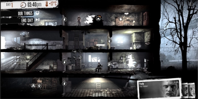 在游戏《这是我的战争》中,狙击手的位置并不在左边的楼顶上,而是在背景的hotel处。玩家需要直接躲在路上掩体后面就能避免被击中。狙击手的射击间隔时间是固定的,玩家在听到枪声后,需要等待下一次枪声响起,然后冲向狙击手所在的位置。狙击手总共有4个掩体,游戏玩家也只能躲在车头后面,车辆尾部对用户毫无作用。最终,玩家需要快速撞开大门就行了,门没锁。