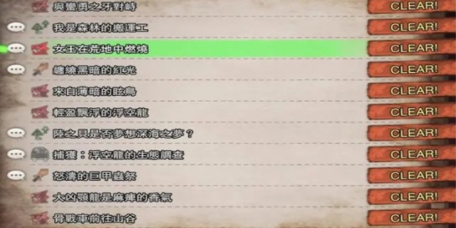 HR3,横冲直撞的狂徙们;险恶的沼泽;分别打土砂龙和泥鱼龙;打泥鱼龙时候会中属性水的异常状态,打消果实可以解。HR4,雷电奔走的飞雷龙;森林暴徙·蛮颚龙。HR5,熔山龙捕捉作战。