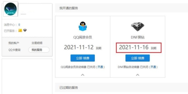在我的服务页面中,找到"地下城与勇士黑钻"服务,查看该服务的到期时间,即可知道黑钻剩余时间。