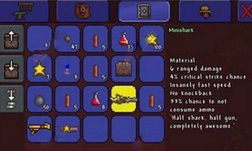 泰拉瑞亚迷你鲨获得方法:1.首先,玩家要在泰拉瑞亚游戏中拥有一间合格房间,至少要有门,桌椅和灯源,空间一定要封闭的,不能太小,没有被npc占领。2.先点击“房屋图标”再点击?号,对目标房间进行检测。3.系统会告诉你房间合不合适,如房间合适也没有npc入住,那么第一步就完成了。4.接下来玩家需要在游戏中获得枪或是子弹,然后将枪和子弹放到背包中,放到箱子里,护卫熔炉等收纳装备里的不算,等待一段时间军火商就抵达了。5.和军火商npc交谈,点击“店铺”,进入购买界面。6.迷你鲨售价35金,任何情况都能选购。将迷你鲨买下放进快捷物品栏中,鼠标选定就能使用了,使用迷你鲨有 1/3 概率不消耗子弹。
