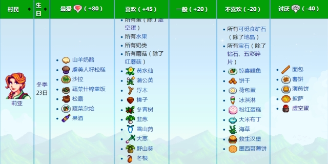 艾芙琳最爱的礼物是钻石、巧克力蛋糕、塞料面包、甜菜、郁金香、玫瑰仙子、五彩碎片、兔子的脚、珍珠、黄金南瓜和魔法糖冰棍。艾芙琳喜欢的物品是黄水仙、咖啡、苹果、杏子、橙子、桃子、石榴、樱桃和枫糖浆。