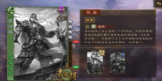 界徐盛的破军技能不仅延续了原版徐盛对敌方进行资源压制的特点,还增加了额外的伤害输出能力,使界徐盛在战斗中更具威胁性。破军的由来是指徐盛几次以少数人马大破对方,使对方不敢前。所以破军之后会进行翻面让对方一回合不能再动,暗指对方暂时不敢前。