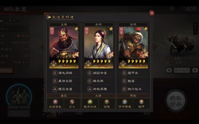 黑科技紫群盾阵容搭配:主将:董卓,战法搭配“神上使/轻勇飞燕/绝地反击/卧薪尝胆”。副将:逢纪,战法搭配“四面楚歌”。副将:华佗/左慈,战法搭配“暂避其峰/刮骨疗毒/挫锐//御敌屏障/八门金锁阵”。阵容分析:此阵容为双核输出,逢纪为主输出,董卓辅助输出。通过藤甲兵降低兵刃损害,逢纪的自带战法可针对智商差距较大的队伍,华佗或左慈确保生存力。缘分队:阵容搭配:主将:吕布,战法搭配“一骑当千”。副将:董卓,战法搭配“神上使/轻勇飞燕/卧薪尝胆”。副将:貂蝉/李儒,战法搭配“美若天仙/御敌屏障/暂避其峰/刮骨疗毒”。阵容分析:吕布是阵容主角,董卓辅助输出。运用缘分效果提高吕布的爆发能力,适合打架和开荒,战损较低。