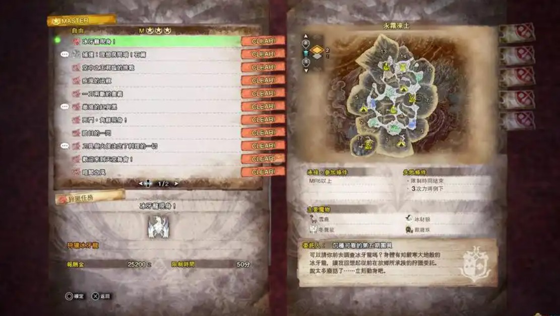 集会所任务:1星任务:“讨伐蓝速龙王”,这是集会所初期的任务,主要是让玩家熟悉集会所的任务流程和战斗方式。2星任务:“讨伐黄速龙王”,这个任务中玩家需要面对比蓝速龙王更强大的黄速龙王。3星任务:“讨伐沙龙王”,沙龙王是一种生活在沙漠中的怪物,需要玩家注意其在沙中的行动和攻击方式。4星任务:“讨伐水龙”,水龙是一种生活在水中的怪物,需要玩家掌握好其在水中的行动规律和攻击时机。5星任务:“讨伐雄火龙”,雄火龙是一种具有强大火焰攻击和飞行能力的怪物,需要玩家掌握好其飞行和攻击的时机。6星任务:“讨伐雌火龙”,雌火龙是一种具有强大毒性攻击和飞行能力的怪物,需要玩家注意躲避其毒性攻击和利用环境进行战斗。7星任务:“讨伐金狮子”,金狮子是一种非常强大的怪物,具有高攻击力和高速度,需要玩家具备一定的实力和经验才能挑战成功。8星任务:“讨伐祖龙”,祖龙是一种传说中的怪物,具有强大的攻击力和防御力,需要玩家具备极高的战斗技巧和装备水平才能挑战成功。