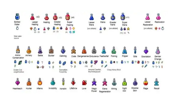 落羽药水:瓶装水+太阳花+闪耀之根+羽毛 勘测者药水:瓶装水+闪耀之根+月光草+金矿石;隐身药水:瓶装水+闪耀之根+月光草;发光药水:瓶装水+太阳花+发光蘑菇;夜视药水:瓶装水+太阳花+闪耀之根;战斗药水:瓶装水+死亡草+腐肉;荆棘药水:瓶装水+死亡草+仙人掌;水上行药水:瓶装水+粉蝶花+鲨鱼鳍;箭术药水:瓶装水+太阳花+晶体;猎人药水:瓶装水+太阳花+闪耀之根+鲨鱼鳍;重力药水:瓶装水+火红花+死亡草+闪耀之根+羽毛;