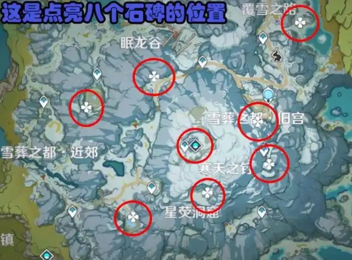 第七个石碑:在寒天之钉下面,需爬到山顶上。第八个石碑:在血葬之都旧宫下面,找到圆盘里的宝箱获得。作用:找到全部八个石碑后,可以激活古老的铭文,解锁一个珍贵的宝箱,获得雪葬星银和锻造图纸等奖励。须弥沙漠:位置:元能尖碑:共有10处,分布在赤王陵、地下等不同地点。作用:需要收集圣章石来复原元能尖碑,每次交付6块圣章石,复原后可以阅读尖碑上的铭文,同时开启一个珍贵的宝箱。每个元能尖碑复原所需的圣章石不同,但数量是固定的。