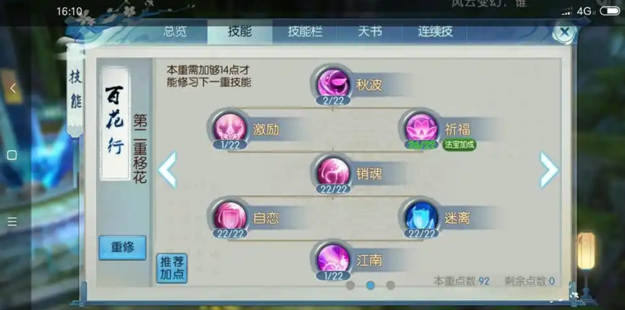 辅助流:技能加点:第一重:落花掌1级,彩云追月满,奇韵满,丰沛满。第二重:回风拂柳2级,木灵缚满,枯木逢春满,根茎满,风语2级,百花缭乱满。第三重:移花接木满,山外清音满,云水满,矫健满,上善满,春风化雨满。天书加点:主空谷,辅不破。特点:以辅助为主,提供治疗和增益效果,大招春风化雨可在释放期间免疫控制并提高防御。适用场景:团队副本、帮战等需要辅助的场景。